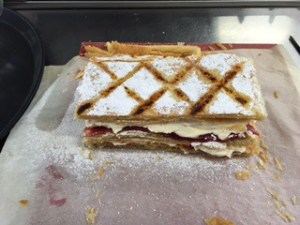 The puff pastry was rolled out into a thin sheet, pricked with a fork and gently tapped at the edges with the edge of our palette knife to encourage the rising of the pastry. Once it was baked and cooled we trimmed the edges and cut this into three equal parts for the millefeuille. We selected the nicest looking piece for the top and set this aside. Then applied some strawberry jam to one piece and covered this with some lightly sweetened whipped cream. Added the second sheet of pastry. Applied the jam and cream again. Then put the last piece on top. Here we dusted with icing sugar and then used heated metal skewers to burn into the sugar on top in a lattice pattern. So lovely!