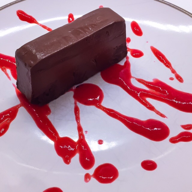 The dessert is a dense, frozen chocolate slice which is served over a splattering of blood-red raspberry sauce. I have adapted it here from its original form to be dairy free. Whilst I chose to use soya cream, you could easily use coconut cream although it might have a little impact on the taste – which might not be a bad thing! I have also opted to use the egg yolk, as per the original recipe. If you were wanting to replace this I might suggest using aquafaba – although I am not sure if this would alter the texture and density. (If anyone of you do try this out, please let me know so I can update this post.)