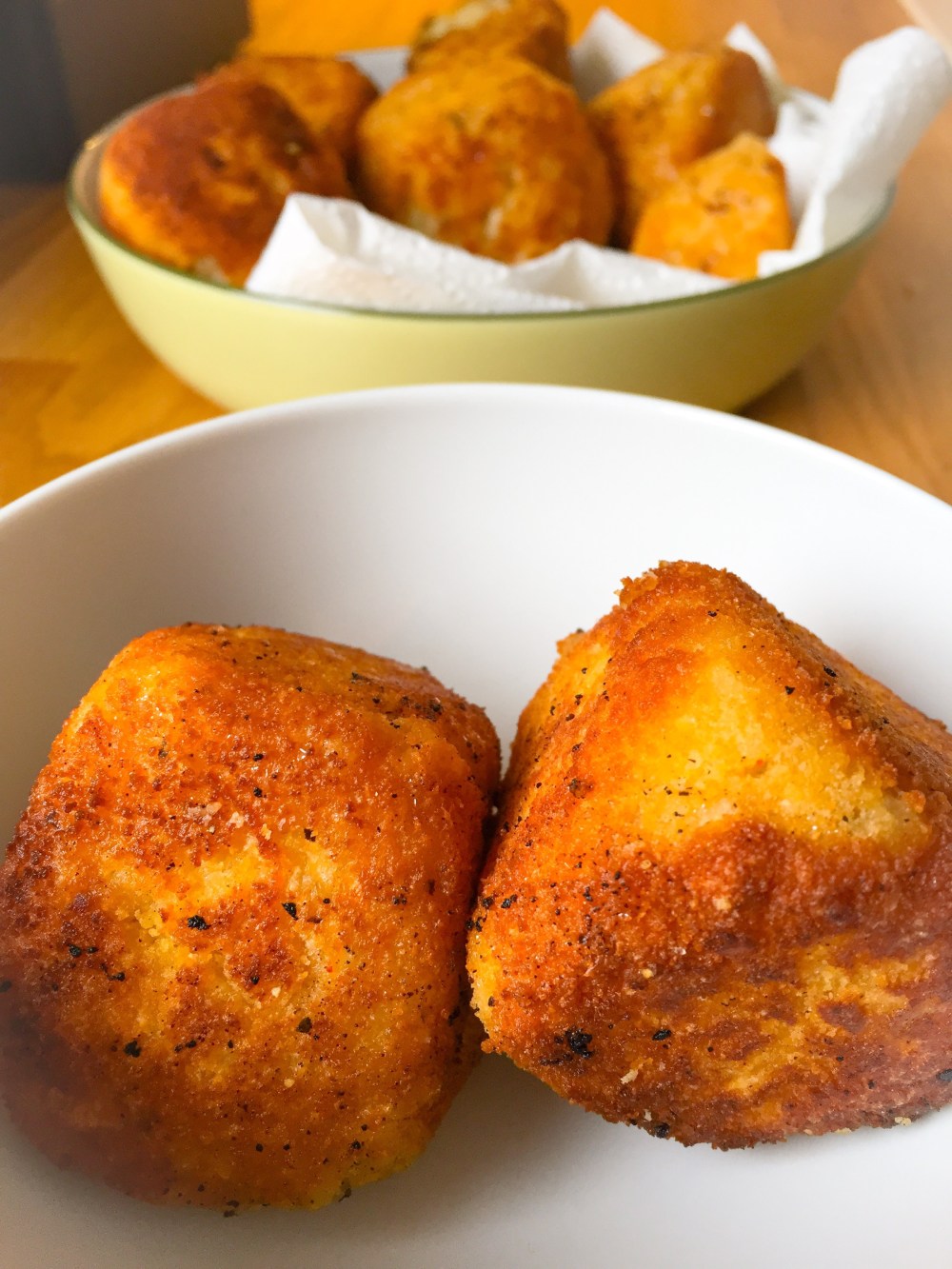Prepare your filling and keep this nearby. Take a scoop of risotto (I use a 1/3 cup measure) into wet hands (this makes it easier to handle) and form a round ball. Using your thumb, press into the middle to form a hole into which you will place your filling. Fill the hole with your choice of filling and cover with some more risotto, the exact amount will really depend on the size of your ball. Taking care none of the filling is seeping out and then set this down on a plate or tray. Repeat until you have used up all the risotto.
